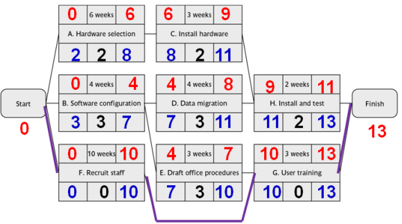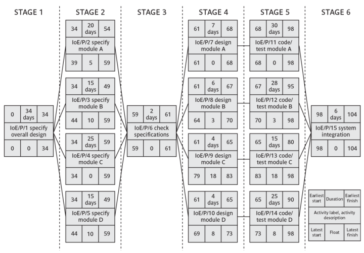 项目的开始时间为2020年4月20日,并用甘特图和关键路径方式显示,产生如下所示的结果,。