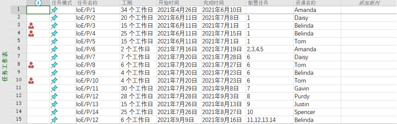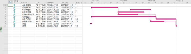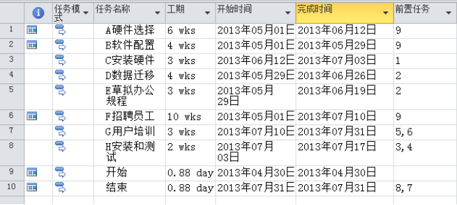 4. 自己多尝试看看project 2010中的其它视图,表格和报表。
