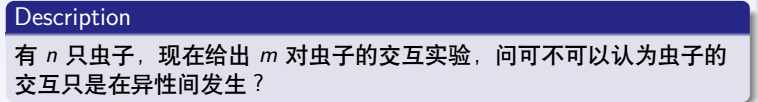 分析这道题,我们可以得出,假如a,b,c三只虫子,a和b可以交配,b和c也可以交配,那么a和c一定是同行,因为他们和同一个异性交配了。所以我们可以把关系抽象成图,在ab之间,bc之间各连一条线长度为1,那么路径长度为双数的两个点一定是同性,单数则为异性。仔细考虑我们不难发现,这是因为性别只有两种,跨越性别单数次称之为异性,跨越性别双数次称之为同性。