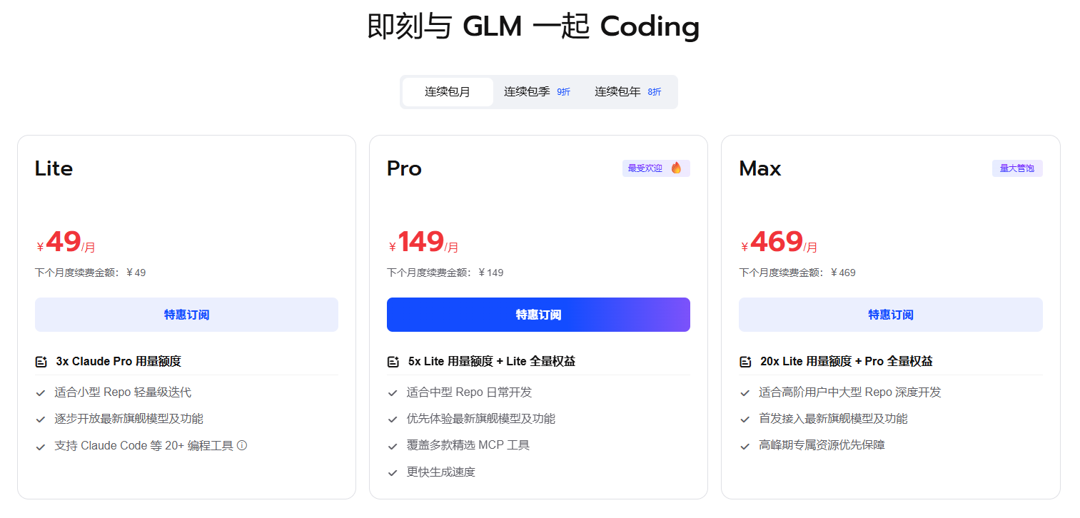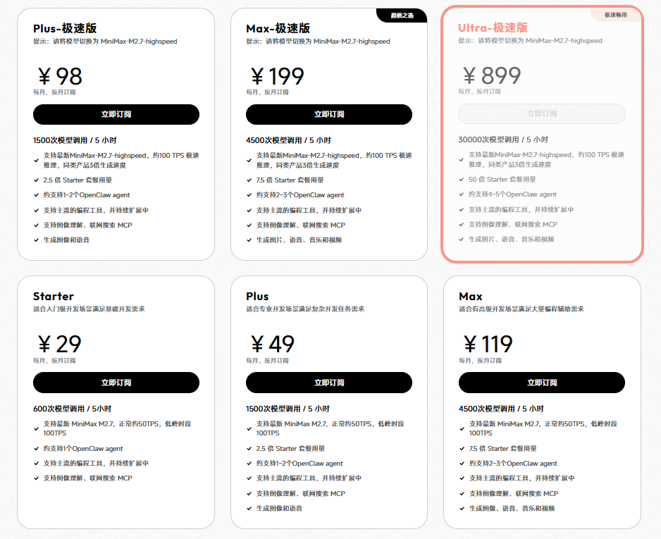 主打自家模型专属体验,从入门到高端档位齐全,额度直接标注调用次数,最透明。