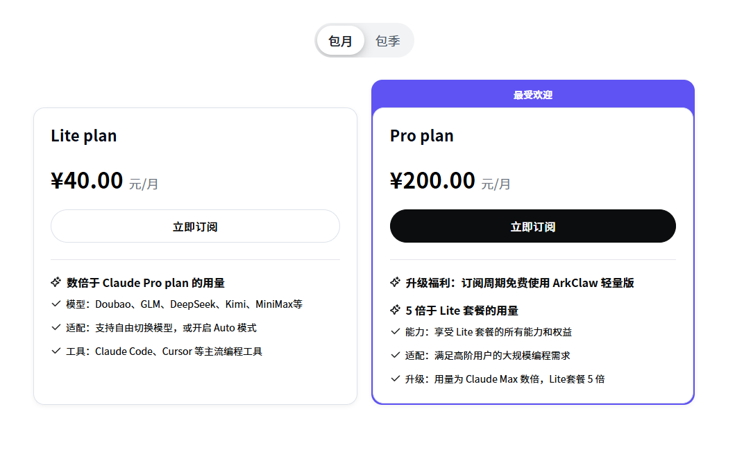 - 定价简单统一:基本只有 Lite/Pro 两档,价格集中在 40 元和 200 元,决策成本低。