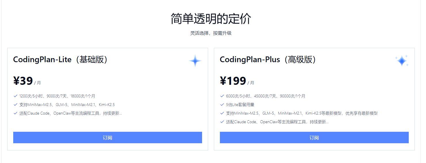 - 定价透明无套路:两档一口价,低价39元,高价199元。不搞饥饿营销、不拆分小时/周限额,付款前就能看清调用量。
