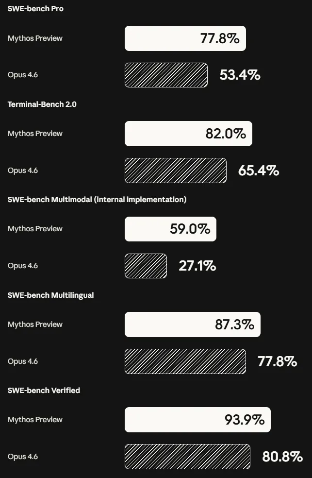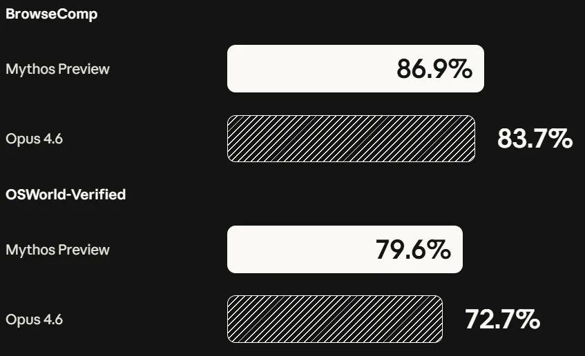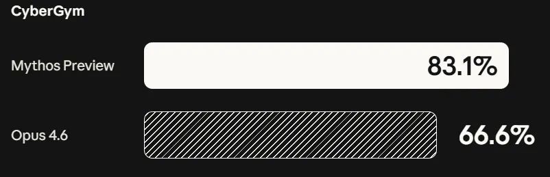 在衡量网络安全漏洞复现能力的 CyberGym 测试中,Claude Mythos Preview 的得分为 83.1%,而 Opus 4.6 仅为 66.6%。