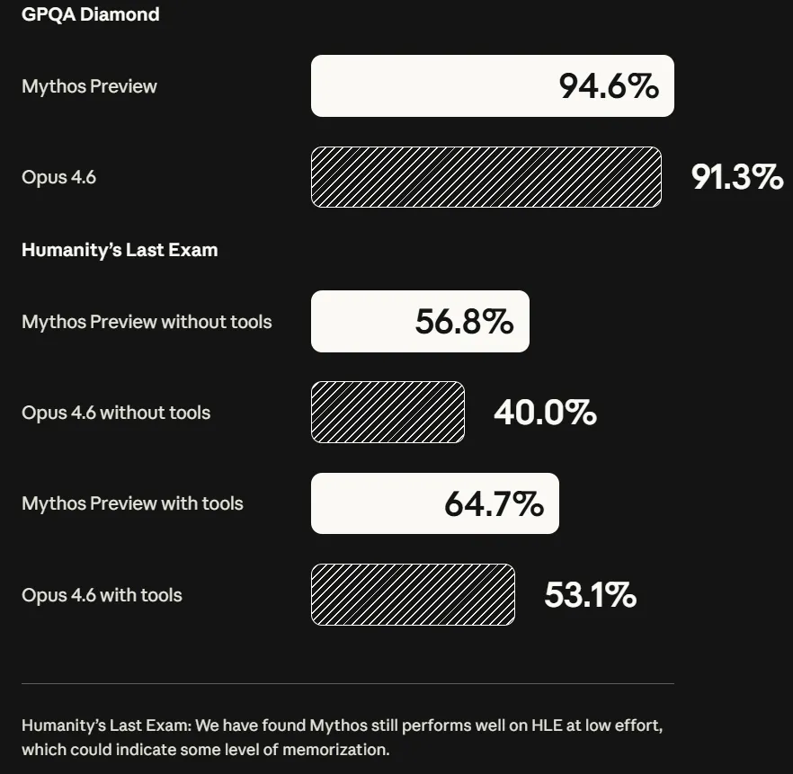 在衡量综合推理能力的测试中,Claude Mythos Preview 同样表现优异。在 GPQA Diamond 基准测试中,其得分为 94.6% ;在极具挑战性的 Humanity's Last Exam 测试中,借助工具的 Mythos Preview 获得了 64.7% 的分数,显著高于 Opus 4.6 的 53.1%。