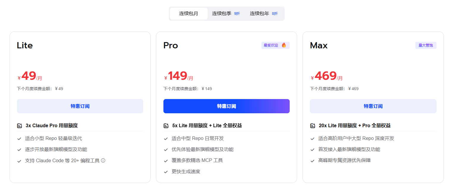 | Max | ¥469/月 | 20x Lite 额度 + Pro 全量权益 | 中大型Repo深度开发、高阶专业用户 | |