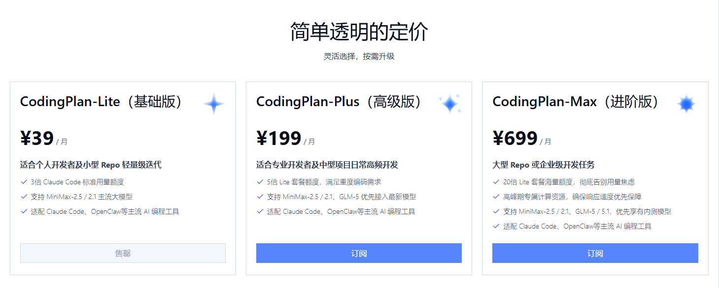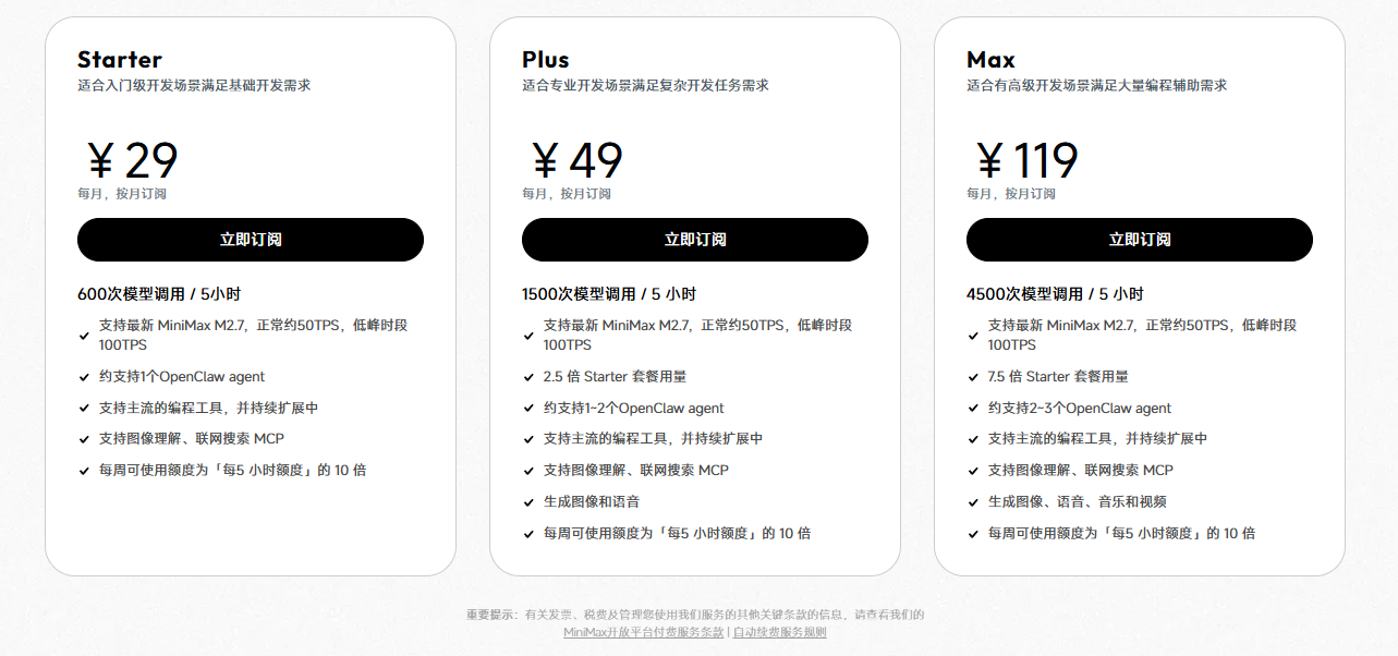 | MiniMax Coding Plan | Starter | ¥29/月 | 600次/5小时,50TPS | 入门级开发、基础开发需求 |