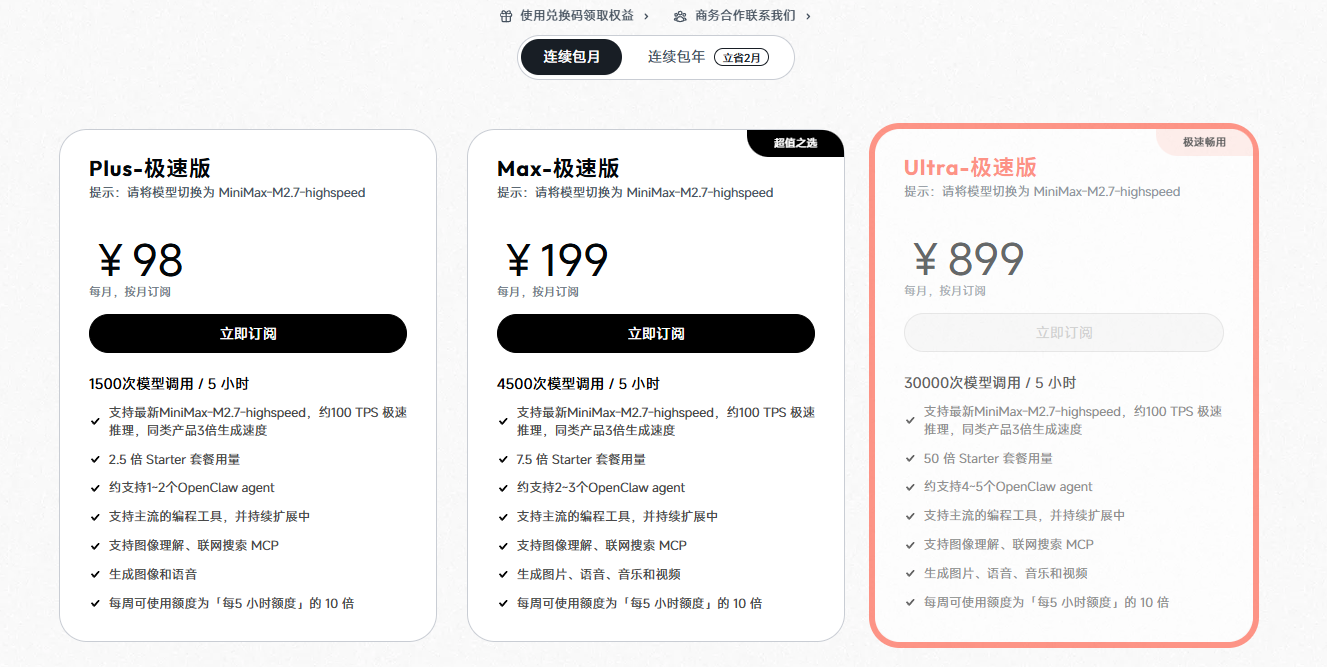 | Ultra-极速版(没了) | ¥899/月 | 30000次/5小时,100TPS | 企业级/重度开发 | |
