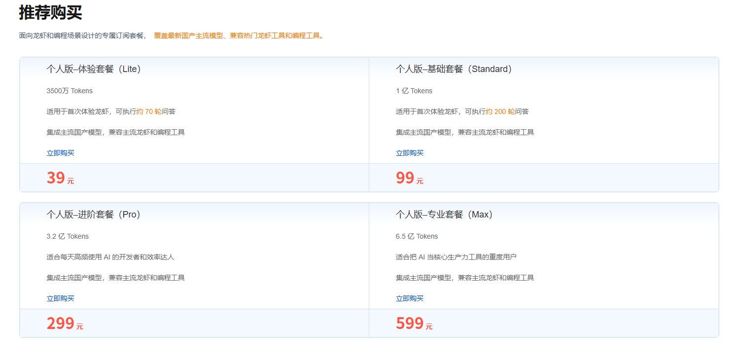 | Allegro | ¥699/月 | Code 60倍、Agent 10倍、专属Claw | 高阶开发、企业级批量任务 |