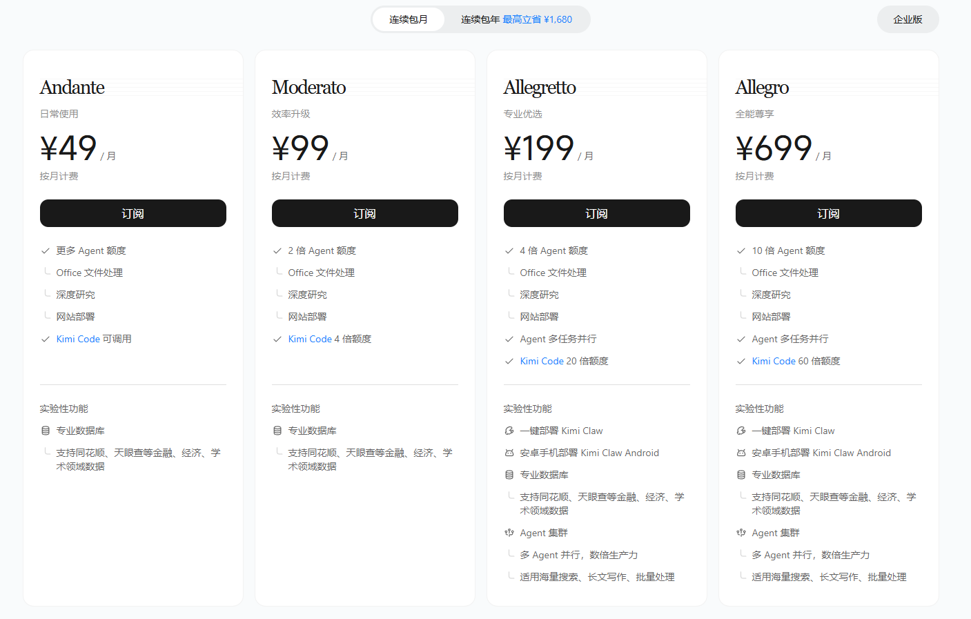 | Kimi Coding Plan | Andante | ¥49/月 | Kimi Code可用、Agent 4倍速优先 | 入门编程、基础Agent |