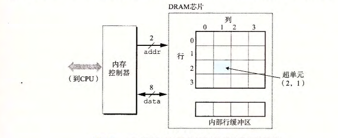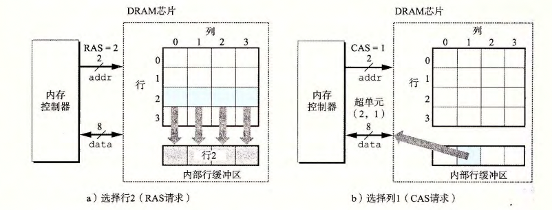 内存控制器通过先发送行地址,DRAM将行数据赋值到内部行缓冲区,再从行缓冲区中复制列信息作为相应。由于行和列信号共享引脚,这样设计有效的降低了引脚的数量。
