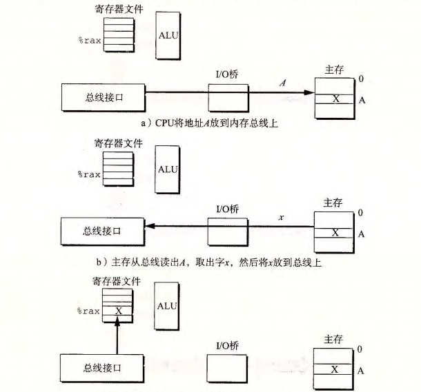 数据流通过总线(Bus)在处理器和DRAM之间进行来回。每次CPU和主存之间的数据都通过总线事务来进行传输。
