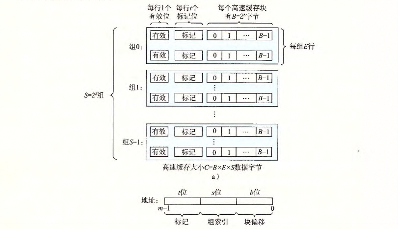 一个计算机系统中,每个存储器地址有m位,形成M = 2 ^ m 个不同的地址。每个机器的高速缓存被组织成一个有S = 2 ^ s 个高速缓存组(cache set)的数组。每个数组包含E个高速缓存行(cache line)。每个行是由一个B = 2 ^ b字节的数据块组成的。一个有效位(valid bit)指明该行是否包含有意义的信息。 t = m - (b + s)个标记位(tag bit) ,作为该块的唯一标志位。
