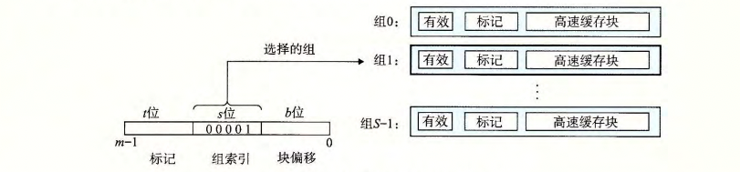 从地址w中抽取出s位,作为组索引位。可以将cache sets看作一个一维数组,那么我们就能通过索引选择目标组;