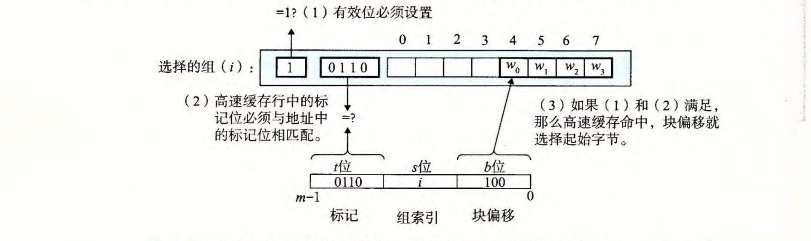 假设存在一个系统,存在一个CPU,一个寄存器文件,一个L1高速缓存和一个主存。当CPU执行一条读内存字w的指令,它向L1高速缓存请求这个字,如果L1高速缓存存有一个w的副本,则命中返回。否则L1则向主存请求w。请求的过程可以分解成三步:1)组选择;2)行匹配 ;3)字抽取。