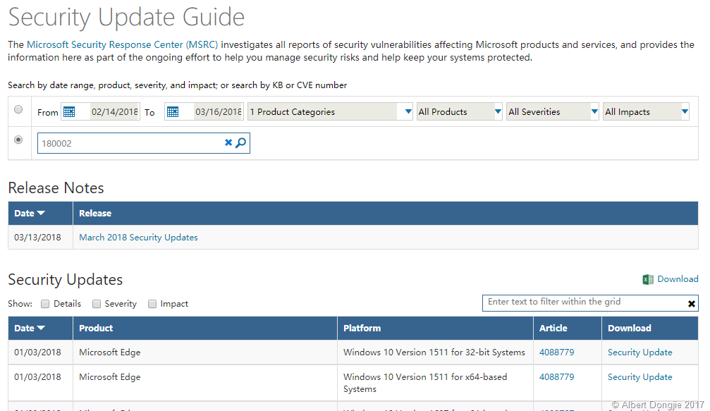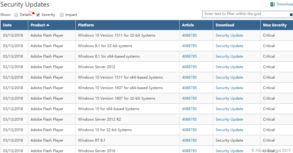 如果希望下载这些安全更新的列表,其中包括日期,知识库文章编号,产品,平台等,则可以单击Excel图标旁边的下载链接。这可让您下载以CSV格式显示在屏幕上的列表。例如,如果您选择列表上方的“严重性”或“影响”按钮,该列将包含在下载的CSV文件中。