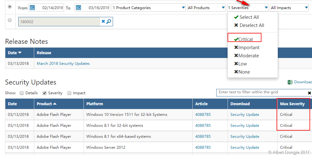 例如,您可以从所有产品类别中选择Adobe来显示Adobe Flash Player的安全更新,Adobe Flash Player是众所周知的黑客最喜欢利用其受害者的软件之一。从列表中,可以单击详细信息,安全性或影响将其他列添加到列表中。我添加了安全列,它显示这些更新被评为“严重”。