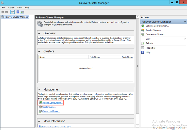 1)创建两个节点的群集,打开群集管理器,点击“Create Cluster…”