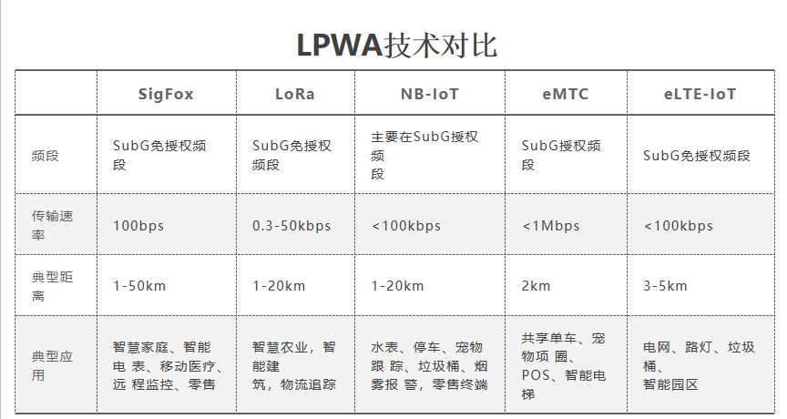 LPWA(Low Power Wide Area)低功耗广域网,LPWA技术覆盖距离更远,功耗更低,安全性和可靠性更高,更能满足行业需求。主要有SigFox、LoRa、NB-IOT、eMTC