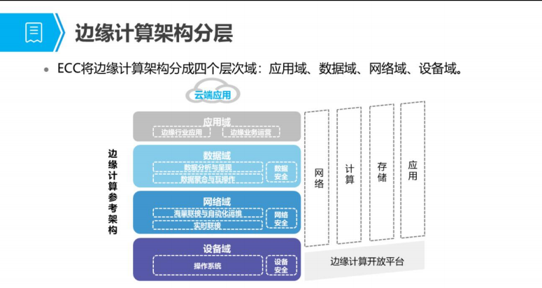 边缘计算联盟ECC针对边缘计算,定义了四个领域:设备域(感知与控制层)、网络域(连接和网络层)、数据域(存储和服务层)、应用域(业务和智能层)。这四个“层域”就是边缘计算的计算对象。