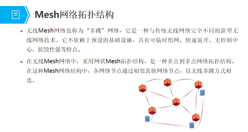 扩展无线信号覆盖范围:比如由一个点传递到另外一个点,如果直接传递,信号可能很弱,如果通过Mesh传递,中间就有了一个中继,这个中继起着一个信号增强,扩大的作用。