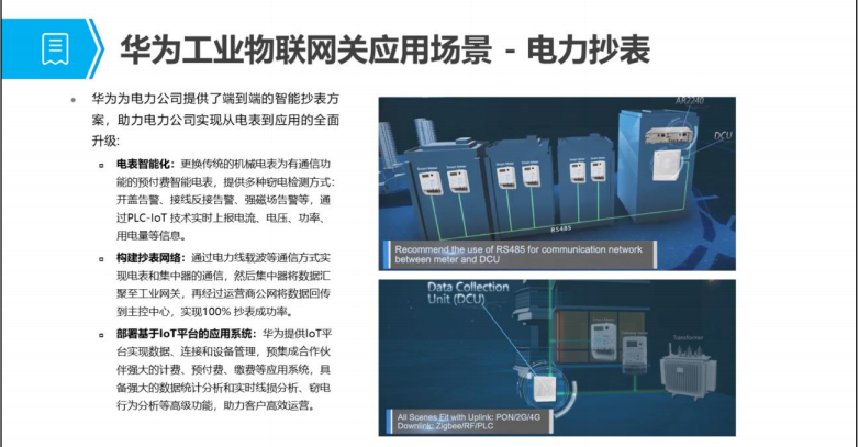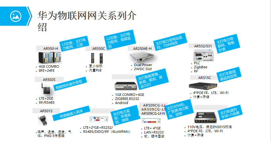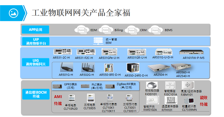 这个全家福里面底层是终端设备,这些终端会通过各种协议(ZigBee、RFID)将数据传递到工业物联网网关,华为根据不同场景制作了应用于不同场景的AR路由器。再往上层,是华为针对工业物联网开发出来的平台型软件,EEM下行连接工业网关,连接这些设备的,上行可以针对性的开发一些app应用,如:照明物联网关的应用,电力物联网关的应用等。