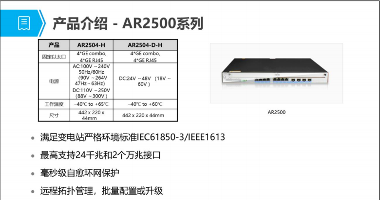 AR2500系列支持二三层线速交换,不仅提供VLAN、STP/MSTP、SEP等二层功能,静态、动态单播路由和组播路由等三层功能,而且集成防火墙、NAT/IPSecVPN等功能,满足工业网络日益复杂的业务需求。