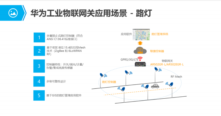 AR502主打场景是照明物联网,这款产品下行主要是RF射频的协议 用来和照明的路灯控制器来进行通信,上行依旧是通过3G或者LTE通过插SIM卡的方式来和网络进行互联。