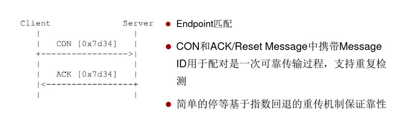 注释:可靠传输是基于CON消息传输的,服务器端收到CON类型的消息后,如果服务器可以处理这个消息,需要返回ACK消息,客户端到在指定时间ACK_TIMEOUT内收到ACK消息后,才代表这个消息已可靠到服务器端,不能处理的话就Rejecting一个消息,一般是返回Reset或者忽略它。