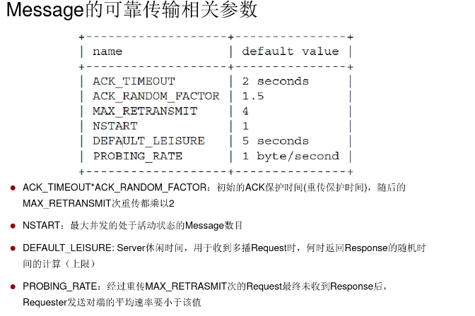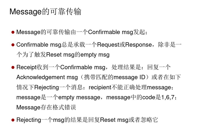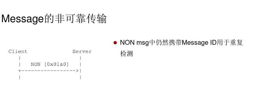 注释:不可靠传输是基于NON消息传输的。服务器端收到NON类型的消息后,不用回复ACK消息。