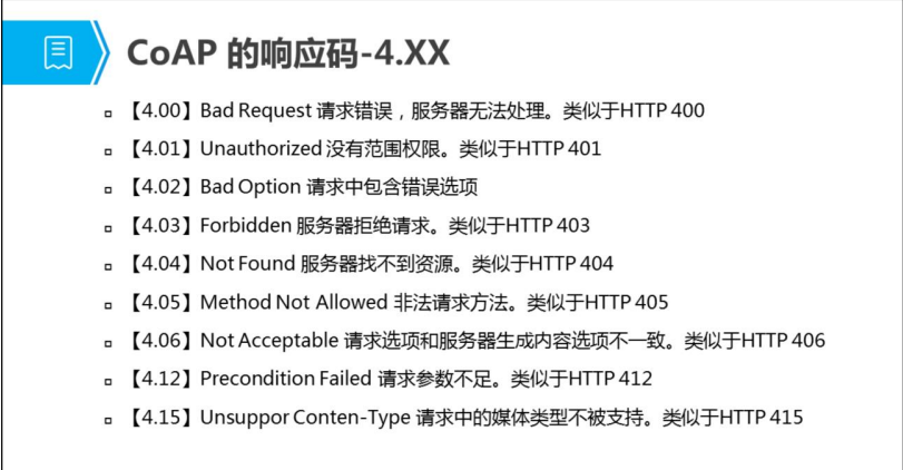 COAP 请求响应Response代码: 响应内容也与HTTP协议类似, 主要有如下3类: