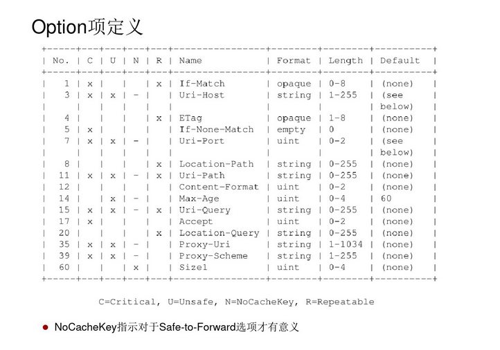 简单的来讲Option作为报文选项有许多的选项编号,每一个编号有不同的选项含义,例如(1——If-Match)(2——Uri-Host),CoAP协议里是用编号来表示选项的含义的,而且是一种增量的方式来表示的,Option的实际编号实际上是根据Option的Delta值和上一个Option相加得出来的,例如上一个Option是12,这个Option Delta是1,12+1=13。