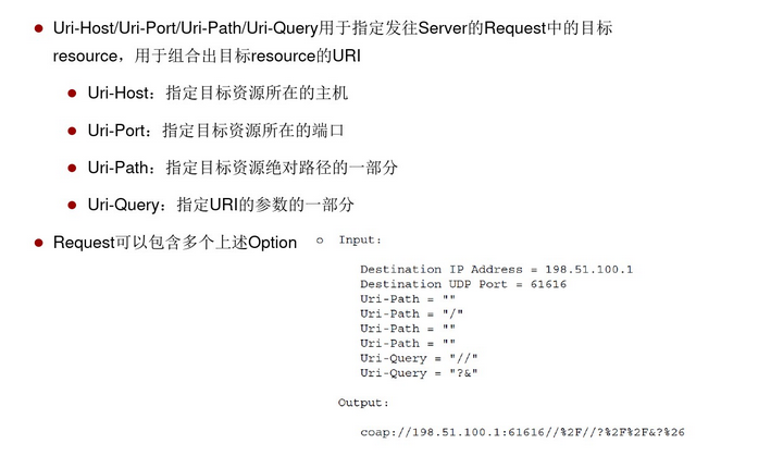 Option:报文选项,通过报文选项可设定CoAP主机,CoAP URI,CoAP请求参数和负载媒体类型等等。