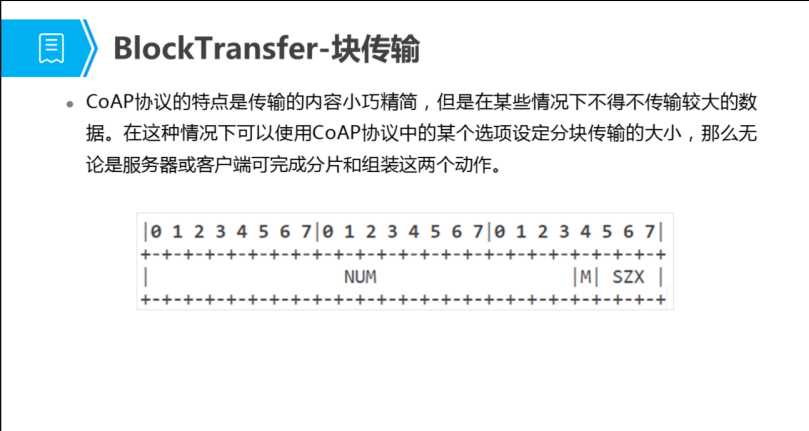 RFC7959定义了CoAP协议的块输出规范,对于resource representation无法通过一个CoAP数据包承载时,发起块传输过程