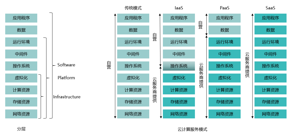 IaaS:如果基础设施层由云服务商提供,其它由用户自营,这种模式称为 IaaS