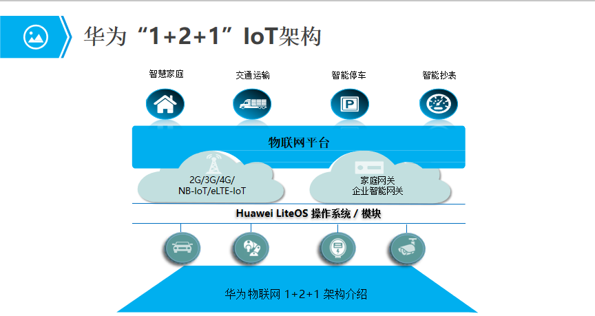 左侧是终端侧的开发,包括MCU(单片机)、模组、运行在NB-IOT上的Huawei LiteOS芯片(也可以运行在MCU上),通过HTTP、MQTT和CoAP协议经过基站到IOT核心网,连接到我们的IOT联接管理平台,经过MQTT、CoAP等协议与垂直行业应用对接。