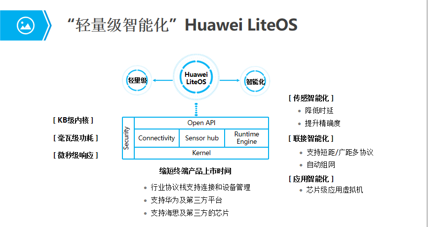 Huawei LiteOS的核心是它的1+N的结构,1是指它的核心Kernel,多是指多个中间件,有互联框架、安全框架、传感框架、运行引擎等。