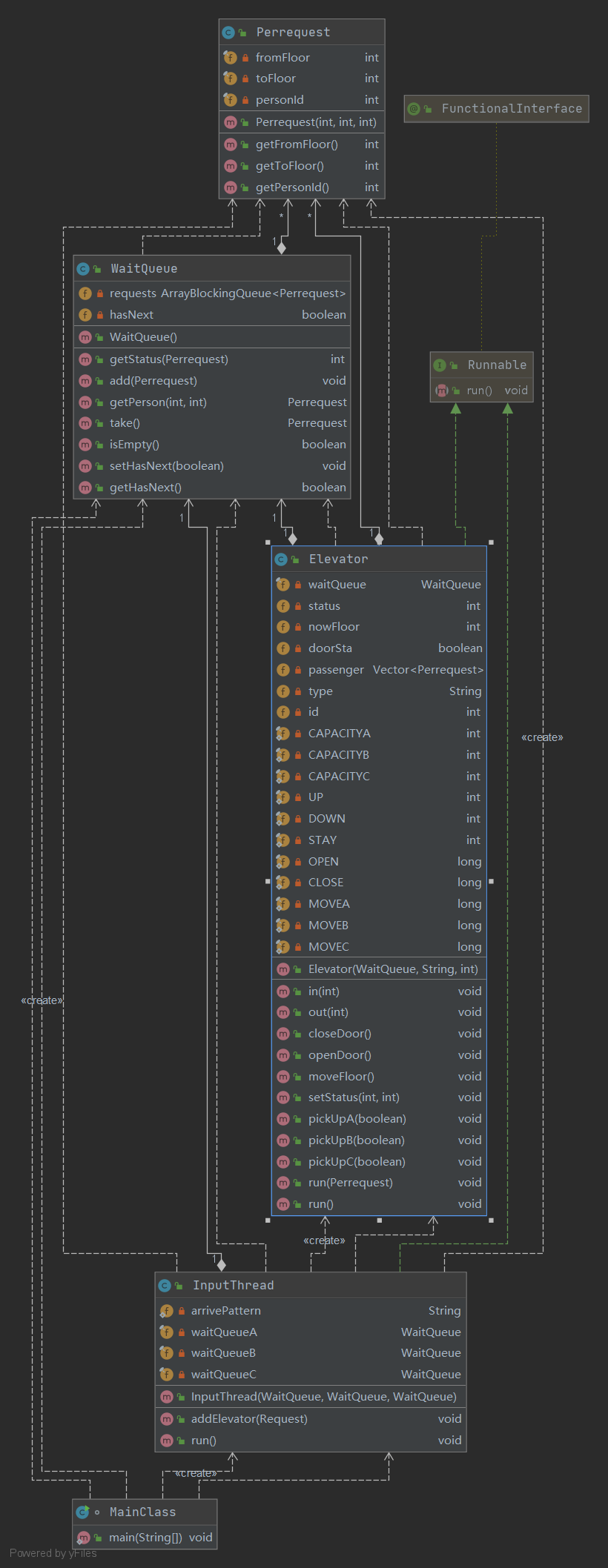 基本的运行流程是电梯请求通过输入线程InputThread放入WaitQueue中,Elevator线程从中不断取出请求,并进行对应的处理,而在电梯运行的过程中会完成捎带的请求。其中比较重要的共享对象就是WaitQueue。