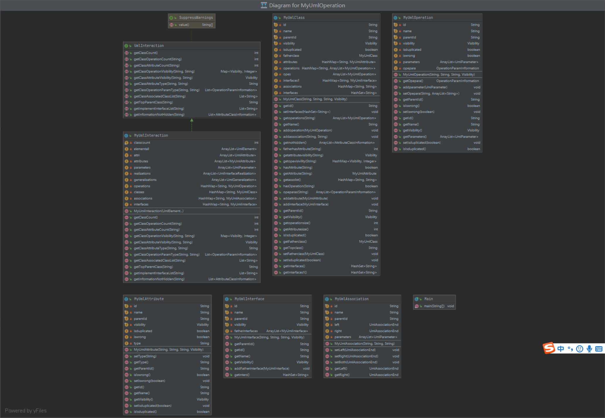 - 层次结构可看为MyUmlInteraction为核心类,完成数据解析。MyUMLClass为次级核心类,存储每个class丰富的各种信息,其他新增类都是从属类,完成对应要求的功能。
