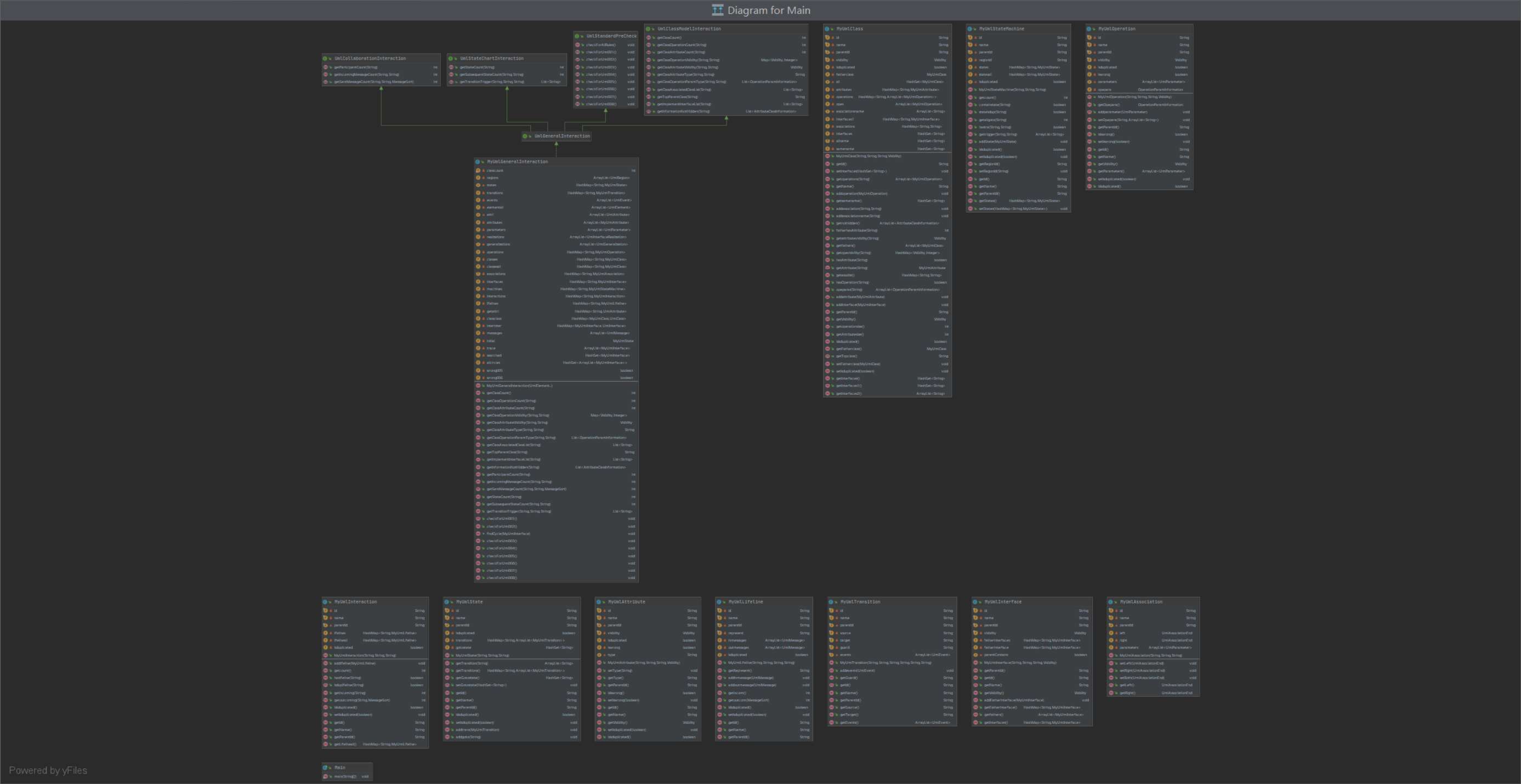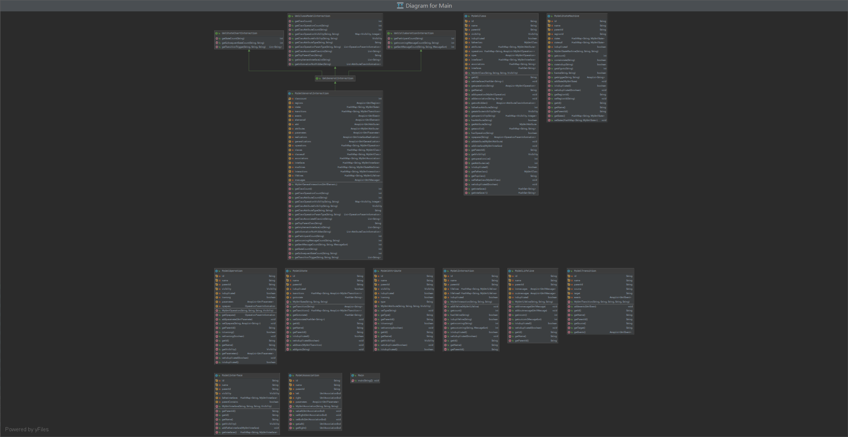 - 层次结构可看为MyUmlGeneralInteraction为核心类,完成所有的数据解析。MyUMLClass,MyUMLInteraction,MyUmlStateMachine三个类分别解析对应的UML图,其他类分别从属于他们之下。