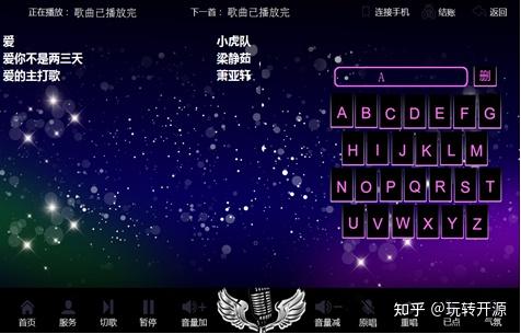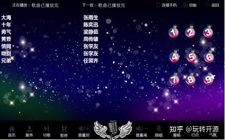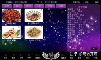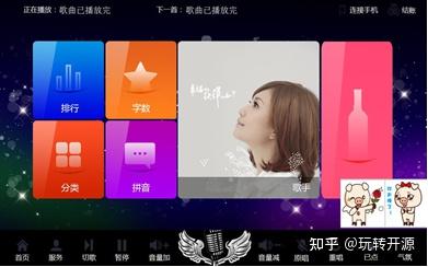 支持点歌、切歌、暂停、音量控制、原唱伴唱、气氛表情、手机端控制、在线点餐、包厢管理等功能。