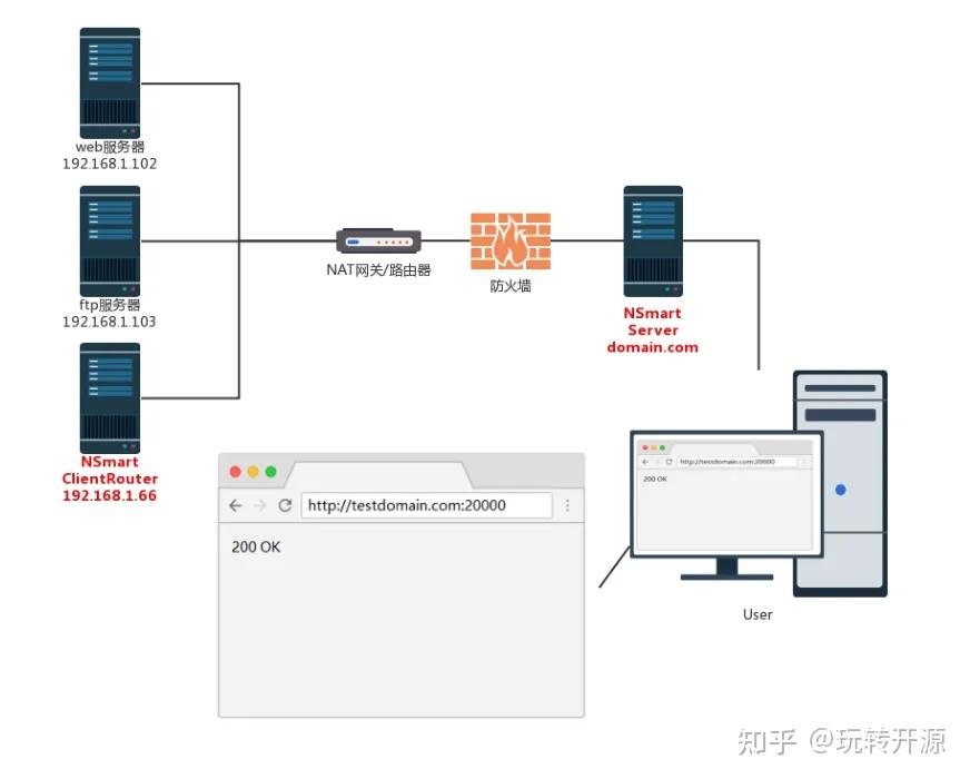 - 客户端(NSmartProxyClient):部署在内网,用来转发访问内网各种服务的请求以及响应。