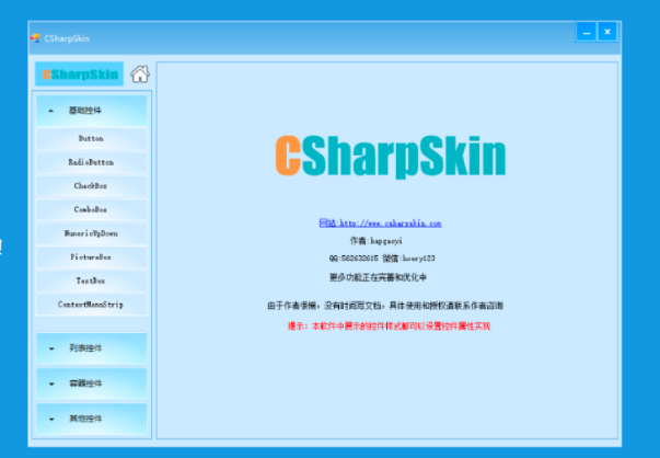 CSharpSkin是一款用于C# Winform的免费开源控件库,主要是对微软自带的常用控件做了外观上的重绘。CSharpSkin项目中某些技能点也参考了互联网相关资料,部分控件代码重绘工作待完善,欢迎大家一起交流贡献。