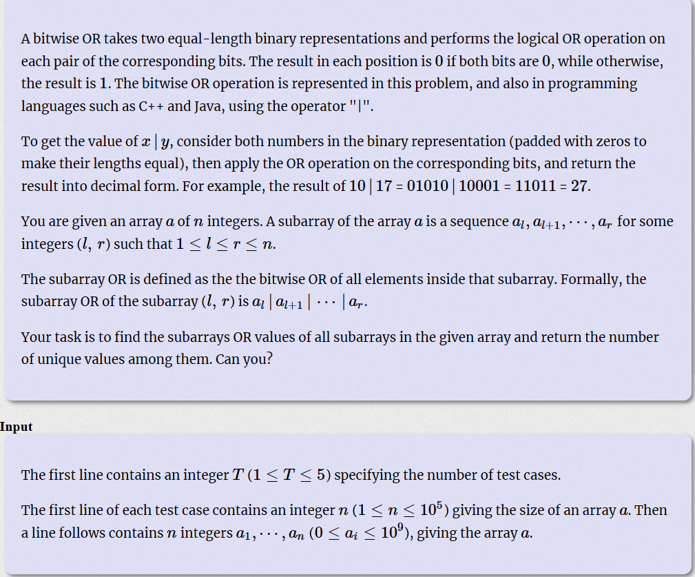 #include <iostream> #include <algorithm> #include <string.h> #include <cstdio> #include <string> #include <cmath> #include <vector> #include <stack> #include <queue> #include <stack> #include <list> #include <map> #include <set> //#include <unordered_map> #define Fbo friend bool operator < (node a, node b) #define mem(a, b) memset(a, b, sizeof(a)) #define FOR(a, b, c) for (int a = b; a <= c; a++) #define RFOR(a, b, c) for (int a = b; a >= c; a--) #define off ios::sync_with_stdio(0) #define sc(a) scanf("%d",&a) #define pr(a) printf("%d\n",a); #define SC(n,m) scanf("%d%d",&n,&m) bool check1(int a) { return (a & (a - 1)) == 0 ? true : false; } using namespace std; typedef pair<int, int> pii; typedef long long ll; const int INF = 0x3f3f3f3f;//1e10 const int mod = 1e9 + 7; const int Maxn = 1e5 + 5; const int M = Maxn * 20; const double pi = acos(-1.0); const double eps = 1e-8; int a[Maxn]; int main() { int t; sc(t); while (t--) { int n; sc(n); FOR (i, 1, n) sc(a[i]); set<int>s, st, ans; FOR(i, 1, n) { s.clear(); s.insert(a[i]); for (auto x : st) { s.insert(a[i]|x); //printf("%d | %d = %d\n", a[i], x, a[i] | x); } st = s; for (auto x : st) { //cout << "答案" << x << endl; ans.insert(x); } } cout << ans.size() << endl; } }