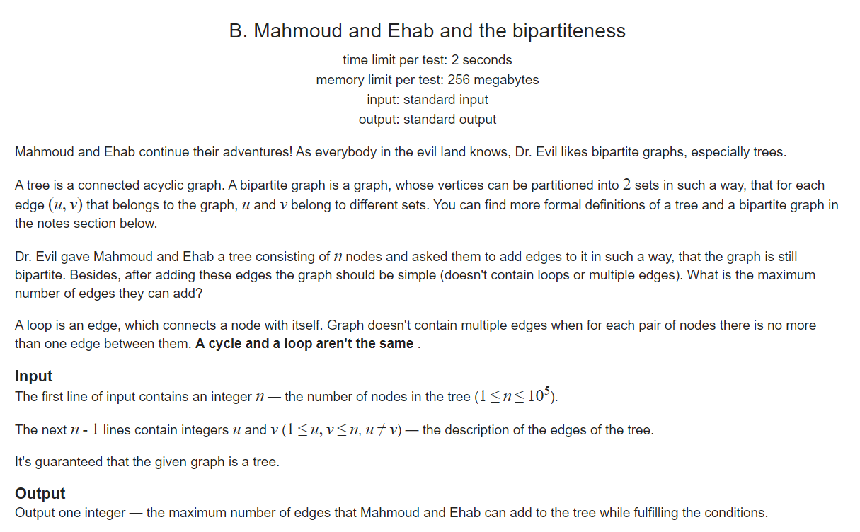 思路:dfs搜索一遍,把深度为偶数的标记为一个值t1,深度为奇数的标记为另一个值t2。结果就是t1*t2-n+1。