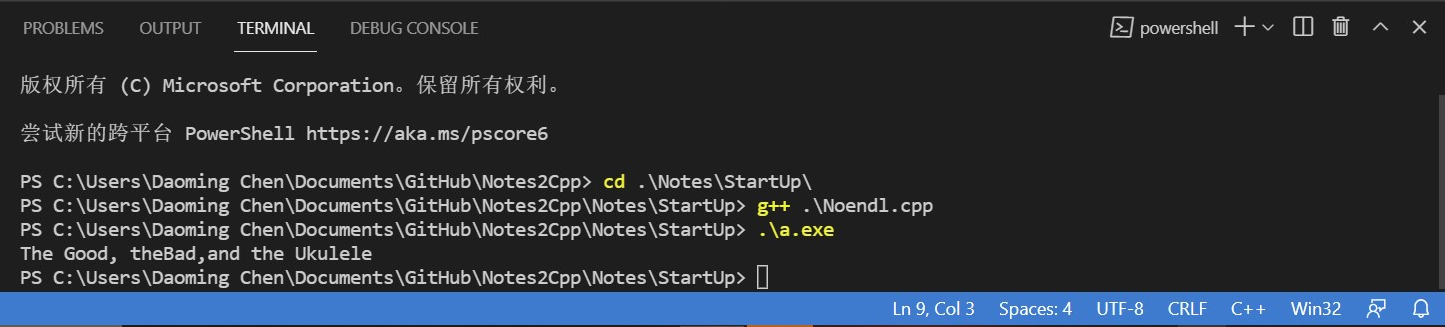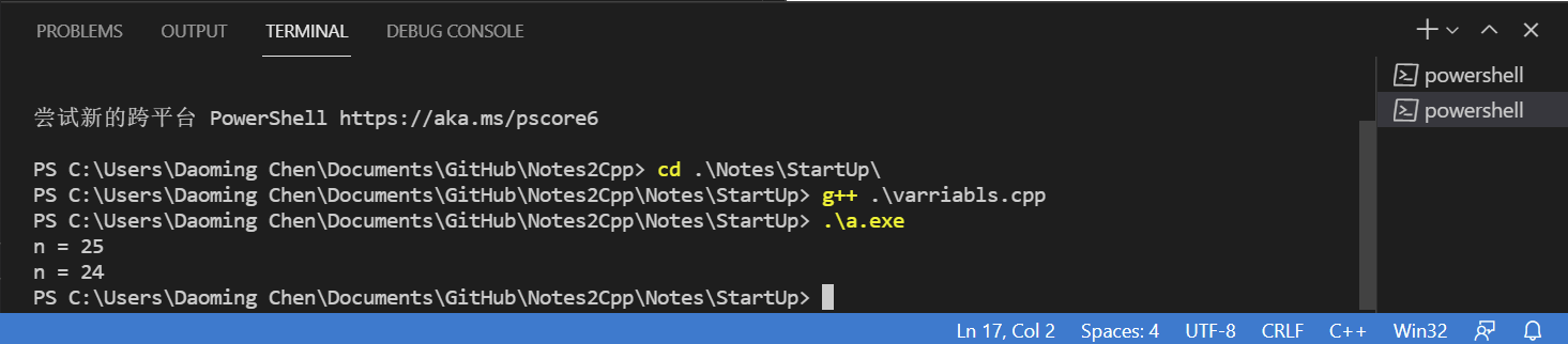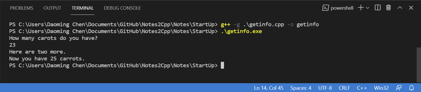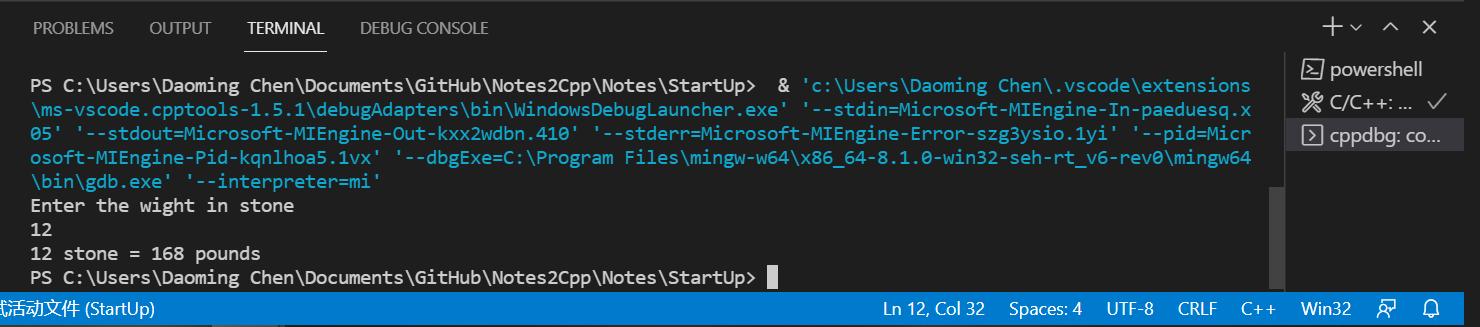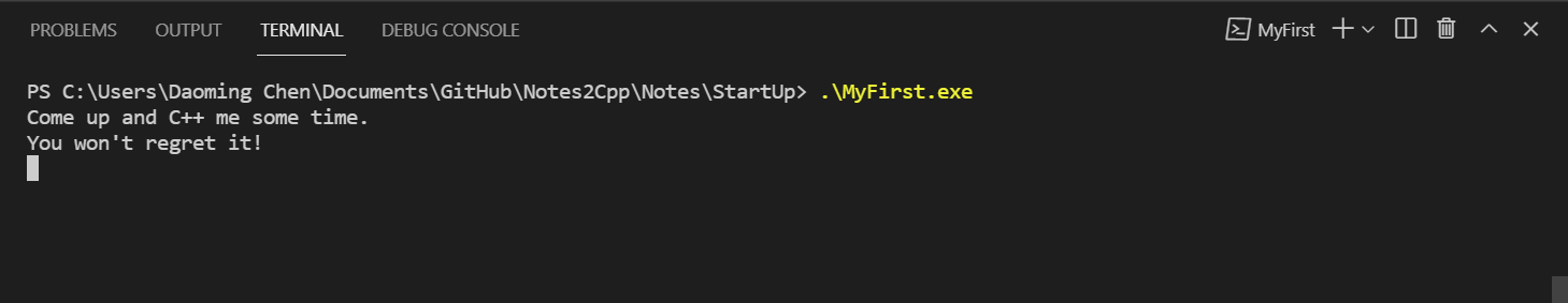 直接在Terimial中输入.\MyFirst.exe我们运行这个文件,结果如下: