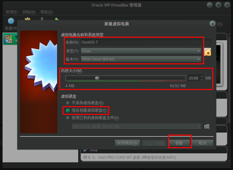 在名称哪里填入CentOS-7,类型选择linux,版本选择other或者redhat。如果cpu是64位的,就选择64位版本,否则就选择32位版本的。内存大小的选择不要超过真实机内存的一半大小,我这里分配2G大小。勾选上 现在创建虚拟硬盘,点击创建。