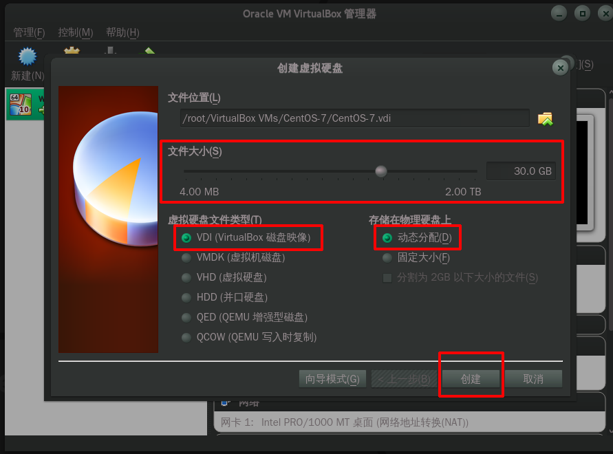 文件位置就是你虚拟机创建后存放的位置,linux默认放在用户家目录里,windows默认放在系统盘,如果空间足够,默认就好。不够,点击右边的文件夹图标可以更换位置。文件大小就是分配给虚拟机的硬盘空间的大小,我这里给CentOS-7分配30G的硬盘。虚拟硬盘文件类型选择VDI,存储在物理磁盘上有动态分配和固定大小。区别是,动态分配会根据你硬盘空间的使用情况来动态分配硬盘多少。固定大小则是你分配多少硬盘,就一次性从硬盘上划出多少空间给虚拟机,相应的真实机硬盘就减少多少大小(有网友说固定大小,性能要好一点)。然后点击创建。