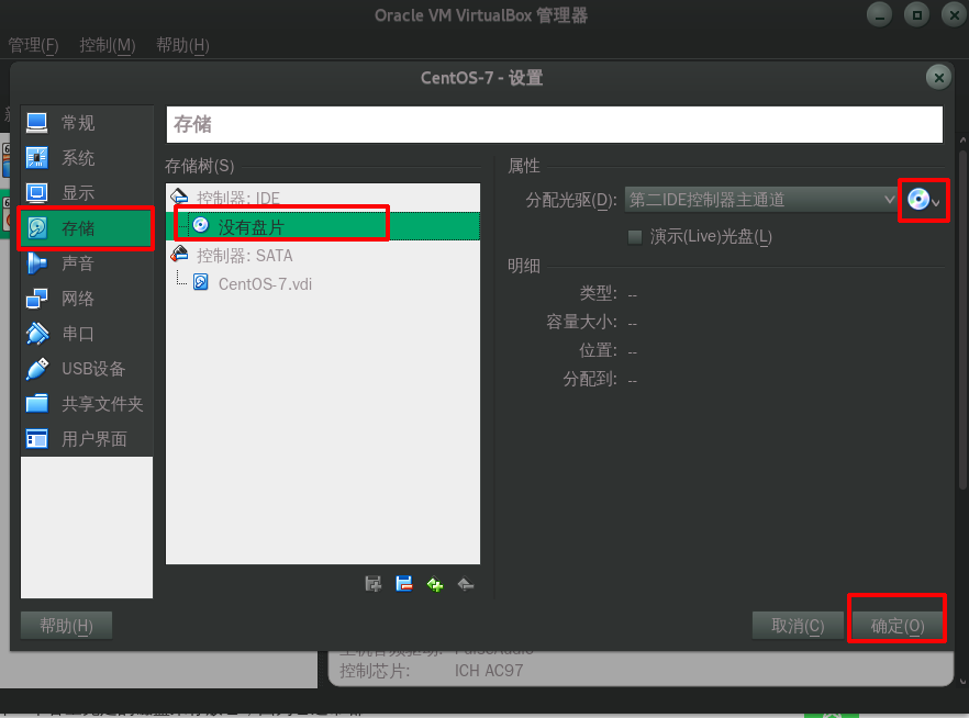 然后在选中存储,单击没有碟片,点击右边的光盘图标,选择你之前下载好的CentOS-7系统镜像打开。