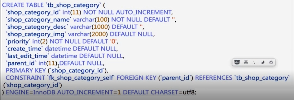 constraint `fk_shop_category_self` foreign key(`parent_id`) references `tb_shop_category`