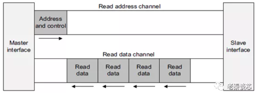 对于读操作,主机(master)通过AR通道发送读事务地址,从设备(slave)通过R通道返回给主机所需要的数据,如下图: